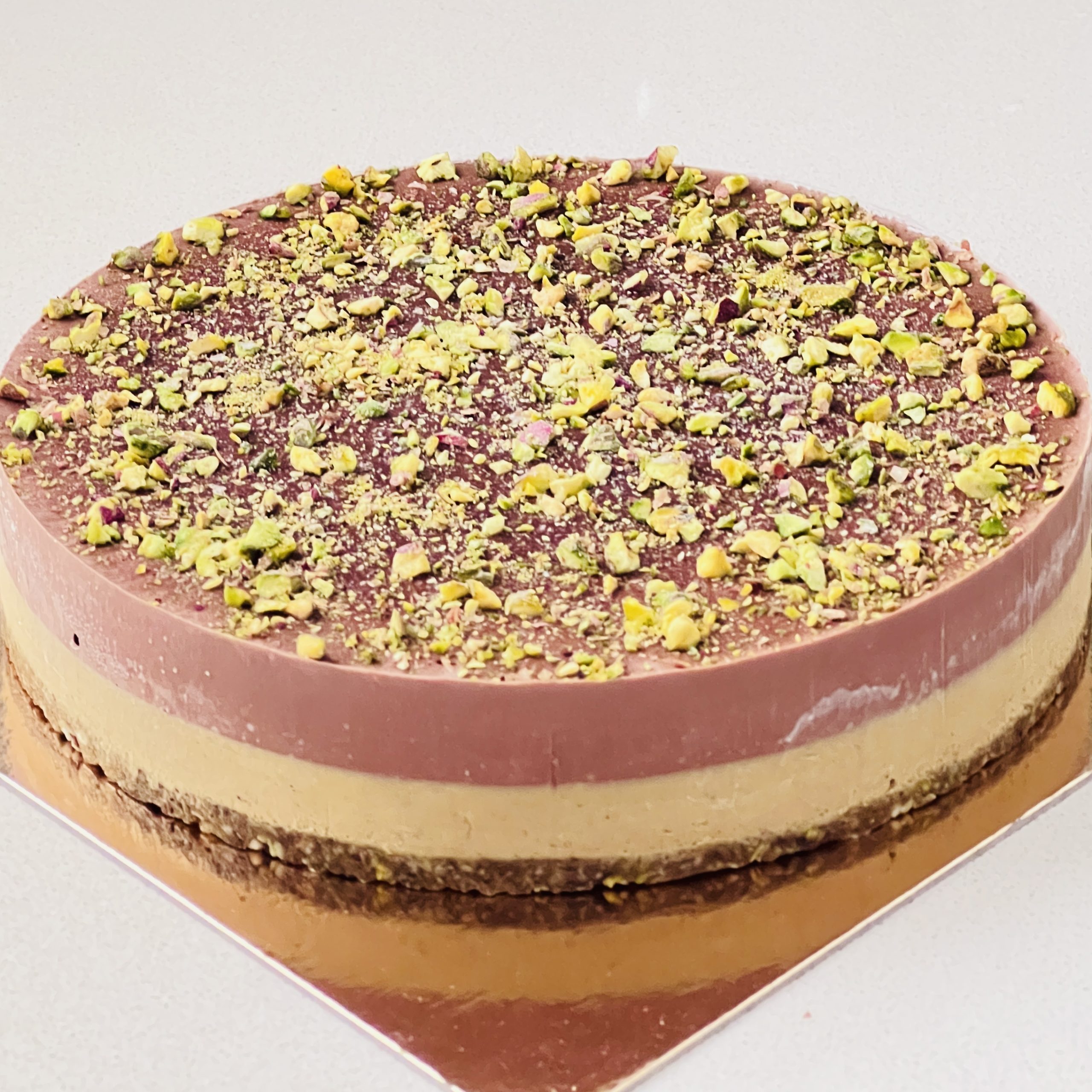 שילוב טעמים קלאסי, עשיר ונפלא עוגה המורכבת מקראסט פיסטוקים ושוקולד, קרם פיסטוק שמנתי וקרם שוקולד עשיר